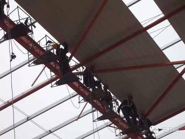 7.5、安裝屋面彩鋼板,拆去屋檐處的專(zhuān)用夾具,用預留的20厘米貼面為玻璃棉收邊。