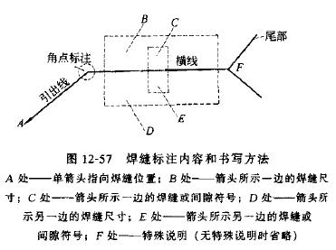 焊縫標注方法,用單箭頭指向焊縫位置,然后畫(huà)出引出線(xiàn)和橫線(xiàn)(必要時(shí)在橫線(xiàn)末繪出尾部)。橫線(xiàn)上下標注焊縫尺寸和焊縫間隙形狀,標注在橫線(xiàn)以上時(shí),表示焊縫在箭頭一側;標注在橫線(xiàn)以下時(shí),表示焊縫在箭頭所指的反面一側。角點(diǎn)處可標注部分焊縫的特點(diǎn),尾部可書(shū)寫(xiě)焊縫的特殊說(shuō)明。
