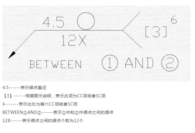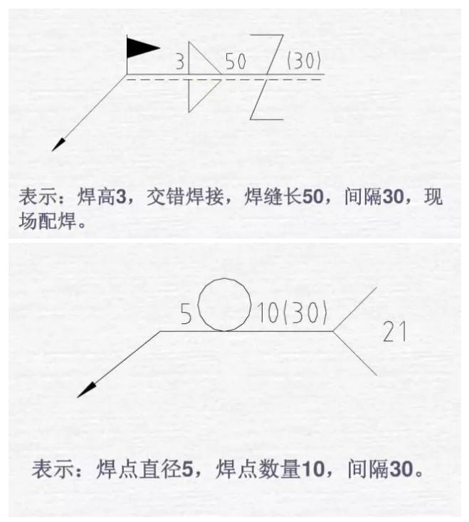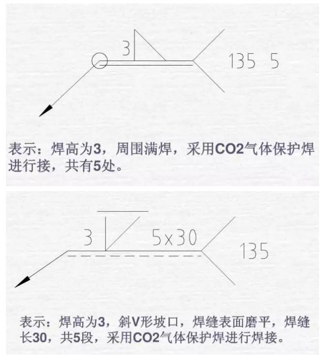 7、焊縫的基本符號、輔助符號和補充符號(尾部符號除外)一律為粗實(shí)線(xiàn),尺寸數字原則上亦為粗實(shí)線(xiàn),尾部符號為細實(shí)線(xiàn),尾部符號主要是標注焊接工藝、方法等內容。