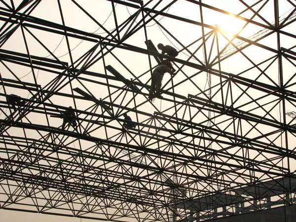 為防止網(wǎng)架整體提升時(shí)與柱子相碰,錯開(kāi)的距離取決于網(wǎng)架提升過(guò)程中網(wǎng)架與柱子或柱子牛腿之間的凈距,一般不得小于10~l125px,同時(shí)要考慮網(wǎng)架拼裝的方便和空中移位時(shí)起重機工作的方便。需要時(shí)可與設計單位協(xié)商,將網(wǎng)架的部分邊緣桿件留待網(wǎng)架提升后再焊接,或變更部分影響網(wǎng)架提升的柱子牛腿。鋼網(wǎng)架在金屬結構廠(chǎng)加工之后,將單件拼成小單元的平面桁架或立體桁架運到工地,工地拼裝即在拼裝位置將小單元桁架拼成整個(gè)網(wǎng)架。網(wǎng)架拼裝的關(guān)鍵,是控制好網(wǎng)架框架軸線(xiàn)支座的尺寸(要預放焊接收縮量)和起拱要求。網(wǎng)架焊接主要是球體與鋼管的焊接。一般采用等強度對接焊,為安全起見(jiàn),在對焊處增焊6~8mm的貼角焊縫。管壁厚度大于4mm的焊件,接口宜作成坡口。為使對接焊縫均勻和鋼管長(cháng)度稍可調整,可加用套管。拼裝時(shí)先裝上、下弦桿,后裝斜腹桿,待兩榀桁架間的鋼管全部放入并矯正后,再逐根焊接鋼管。