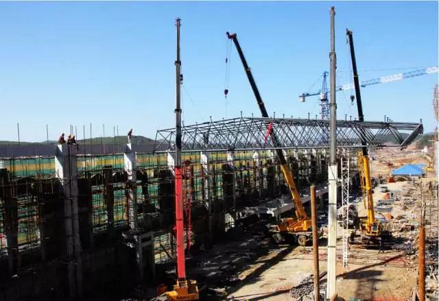 球節點(diǎn)的大型鋼管網(wǎng)架的安裝,我國目前多用拔桿提升法。用此法施工時(shí),網(wǎng)架先在地面上錯位拼裝,然后用多根獨腳拔桿將網(wǎng)架整體提升到柱頂以上,空中移位,落位安裝。
