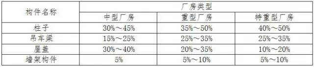 各種構件的用鋼量占整個(gè)廠(chǎng)房鋼結構的總用鋼量的比值大致如表所示。