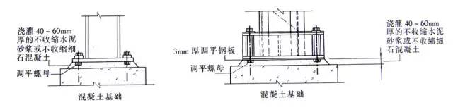 鋼柱的安裝方法一般采用三種方法,即采用鋼墊板方案、座漿墊板方案和調平螺帽與調平鋼板方案