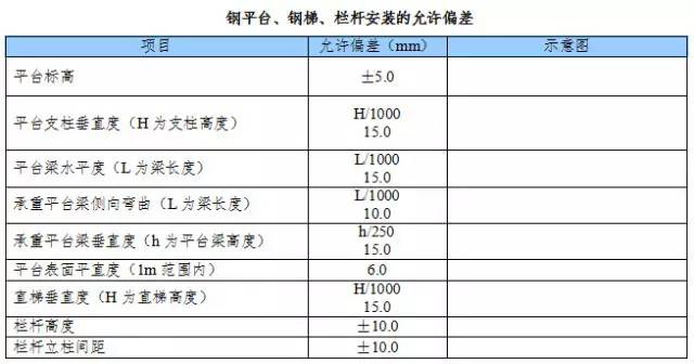 (4)平臺、梯子和欄桿安裝的允許偏差應符合下表規定。
