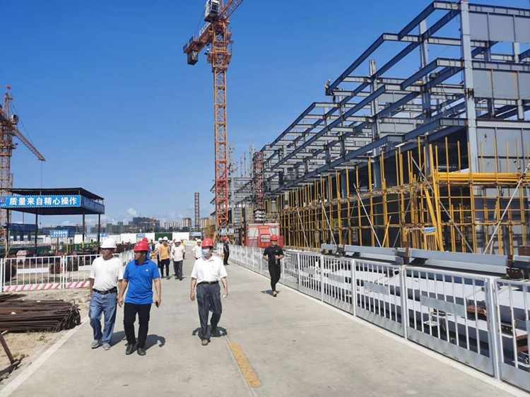 考察團主要參觀(guān)了主體結構已經(jīng)施工的19#樓~22#樓。參觀(guān)過(guò)程中提出了地下室柱腳與基礎筏板鋼筋連接處理節點(diǎn)問(wèn)題,鋼結構安裝進(jìn)度及裝配率等問(wèn)題。隨后考察團一行人到會(huì )議室與我司管理人員進(jìn)行深度交談。我司楊總和陳經(jīng)理一一介紹了本項目的規模和用鋼量,項目采用了我司專(zhuān)利-隱式鋼框架結構體系,裝配率滿(mǎn)足政府申報裝配式住宅要求,并對構件加工流程,進(jìn)場(chǎng)流程,安裝流程,驗收流程,與土建工程施工工藝的對接合理安排,各節點(diǎn)問(wèn)題也做了詳細的說(shuō)明,同時(shí)所有鋼構件由我司自有加工廠(chǎng)加工,能很好的控制項目成本及質(zhì)量。