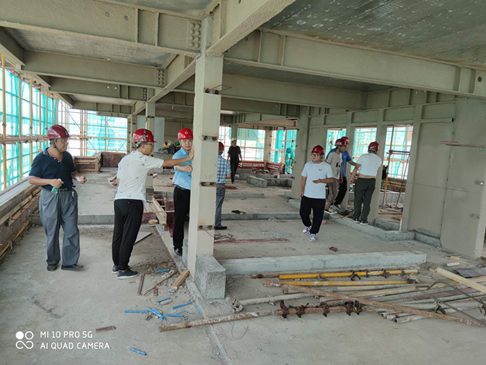 劉總分別帶領(lǐng)考察團到20#、21#樓參觀(guān),為考察團詳細講解了焊接、鋼柱鋼梁節點(diǎn)、樓承板的施工工藝和工序等內容,重點(diǎn)講解項目所采用的鐵木辛柯-隱式框架專(zhuān)利體系,裝配率滿(mǎn)足政府申報裝配式住宅要求,且具有無(wú)凸梁凸柱、得房率高的優(yōu)勢。
