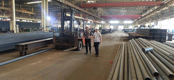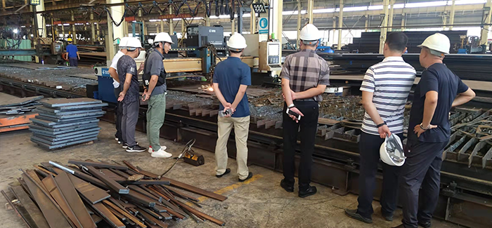 隨后來(lái)到我司鋼結構加工生產(chǎn)基地考察,劉總工將各工廠(chǎng)的規模、生產(chǎn)能力、鋼結構的全生產(chǎn)周期等進(jìn)行一一講解。雙方就施工圖設計、深化設計、材料采購、加工制造、構件運輸、現場(chǎng)安裝、工期分析及重難點(diǎn)控制措施等問(wèn)題深入交流。