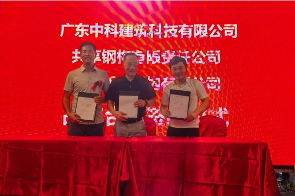 2024年6月15日,海南浙大鋼構有限公司、共享鋼構有限責任公司與廣東中科建筑科技有限公司鋼筋桁架樓承板三方戰略合作簽約儀式在?诔晒εe行。浙大鋼構總經(jīng)理方建平、共享鋼構常務(wù)副總葉偉標,中科建筑總經(jīng)理萬(wàn)飛翔等領(lǐng)導出席簽約儀式。